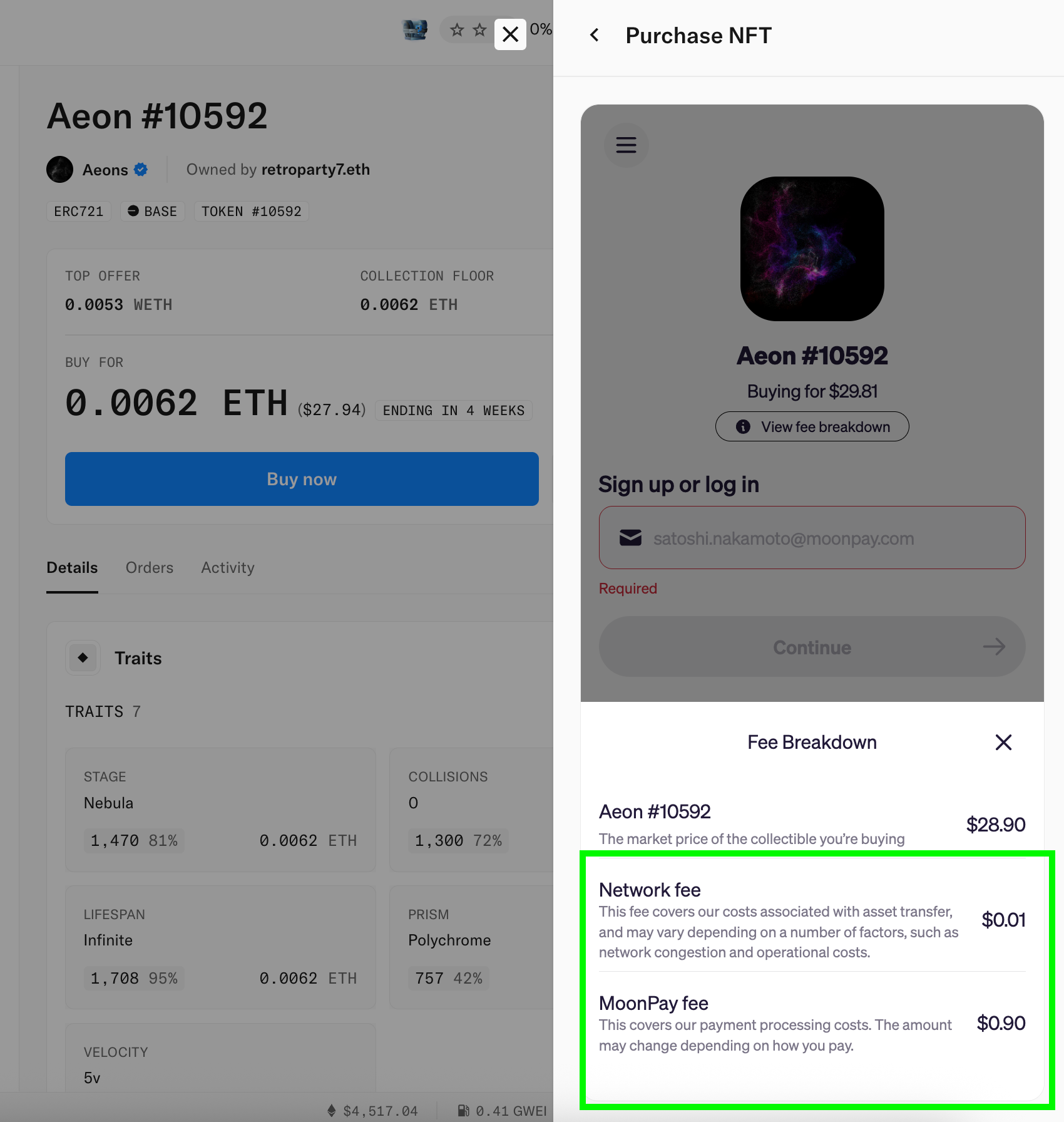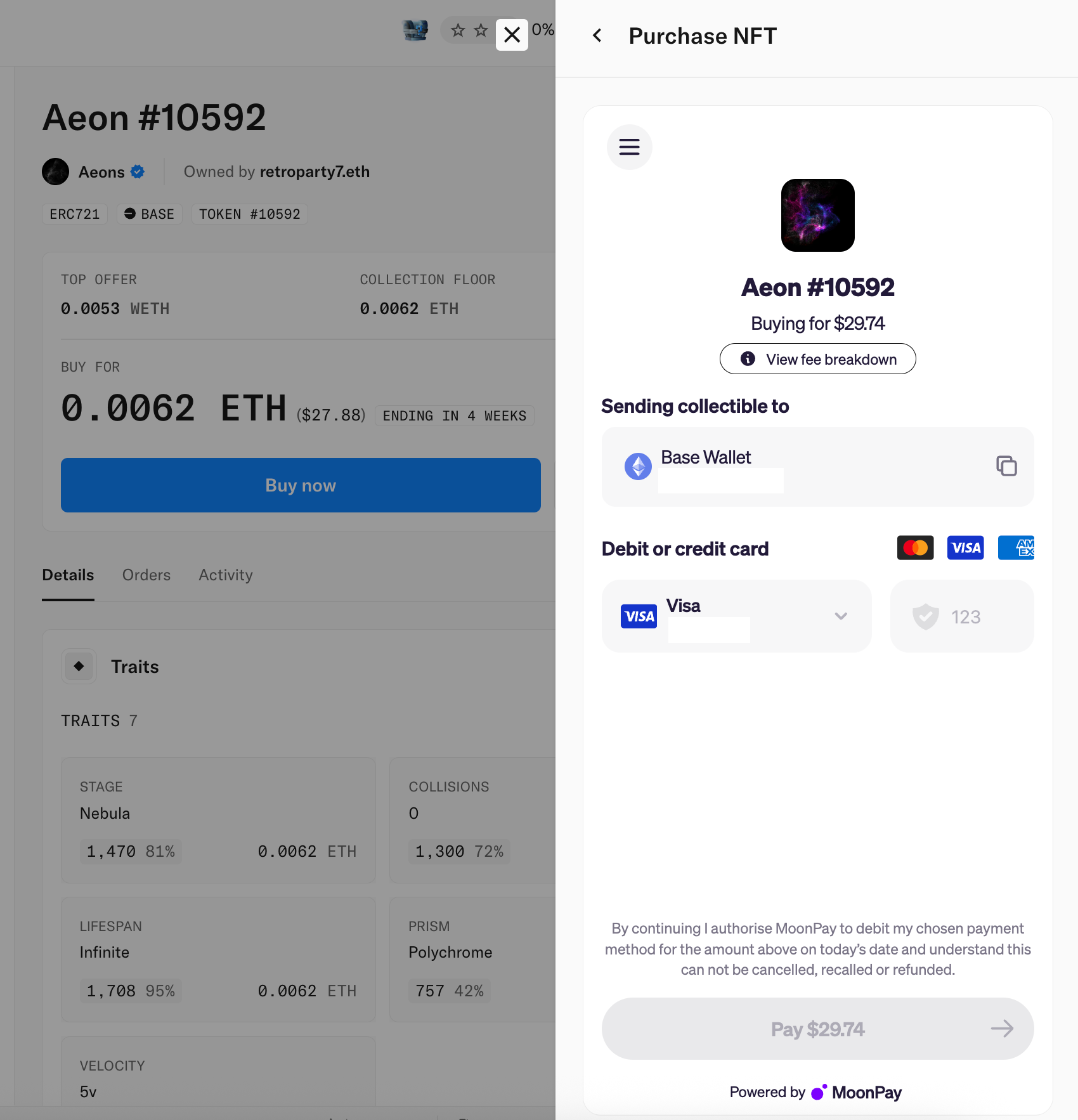 You may notice that your total is higher than the listed price for that NFT. This is due to network (“gas”) fees and, if you’re paying with a card, processing fees charged by MoonPay.